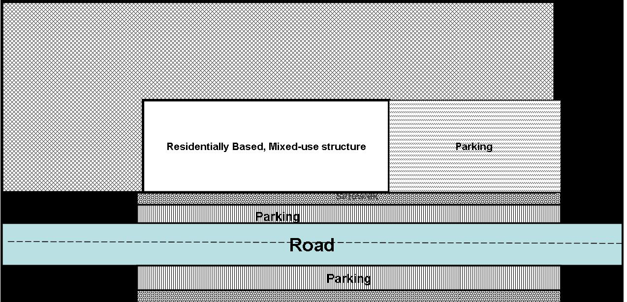A maximum of 50% of the required parking spaces may be grass or other pervious material. All other parking shall be paved. Shared parking with adjacent non-residential districts is encouraged.