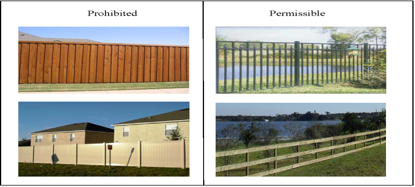 Fences shall be constructed of ornamental wrought iron, other ornamental metals manufactured for fences, or wood. PVC fencing, chain link fencing and privacy fencing (more than 20% opaque) is prohibited within 50 feet of the SR 17 right-of-way. Property located outside of scenic vistas may use these fences provided a Type A buffer is installed between the required 25 foot SR 17 roadway landscape/buffer and the fence. When chain link fencing is utilized, only black vinyl coated chain link fencing shall be permitted. Opaque fences along SR 17 shall be prohibited. Fences that are regularly interspersed with openings and allow views into and through the property are permissible.