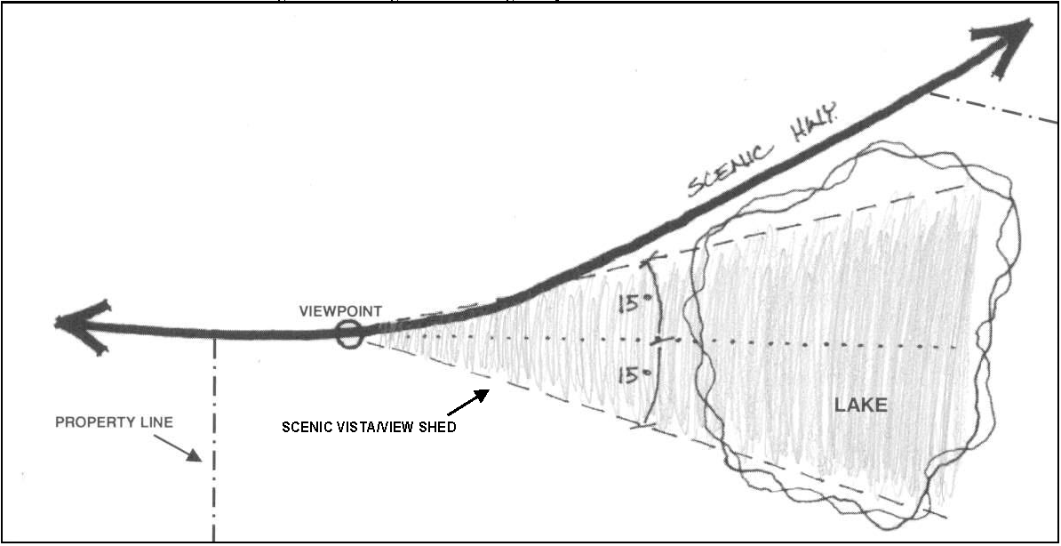 Each of the Ridge Scenic Highway Scenic Vistas resemble cones and are established as a 30-degree angle measured in equal 15-degree angle segments measured from the Ridge Scenic Highway right-of-way to the primary vista amenity of interest (see Figure G).