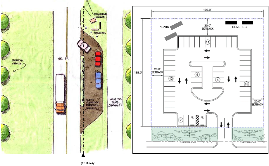 Scenic Overlook Pull-Off parking areas shall provide parking at a ratio suitable for the purposed intended. With the exception of driveways and drive aisles, parking spaces may be left unpaved, provided the soil is stabilized and covered with groundcover plantings, mulch, gravel, or shellrock and wheelstops to define each space.