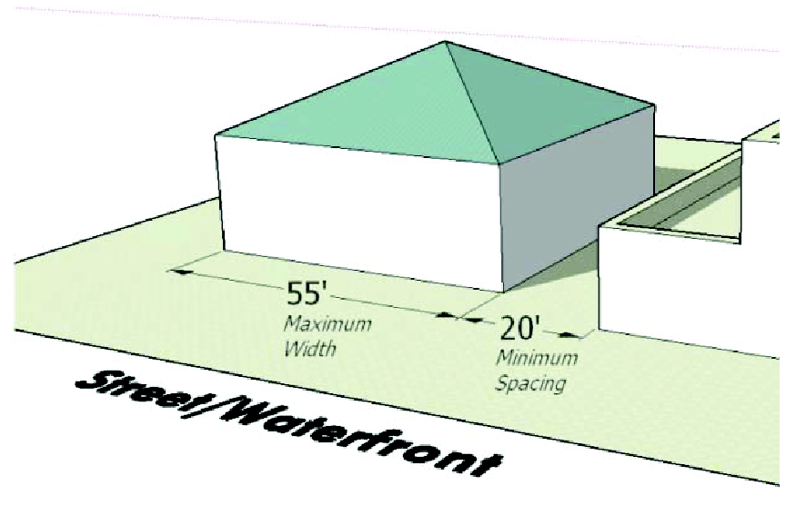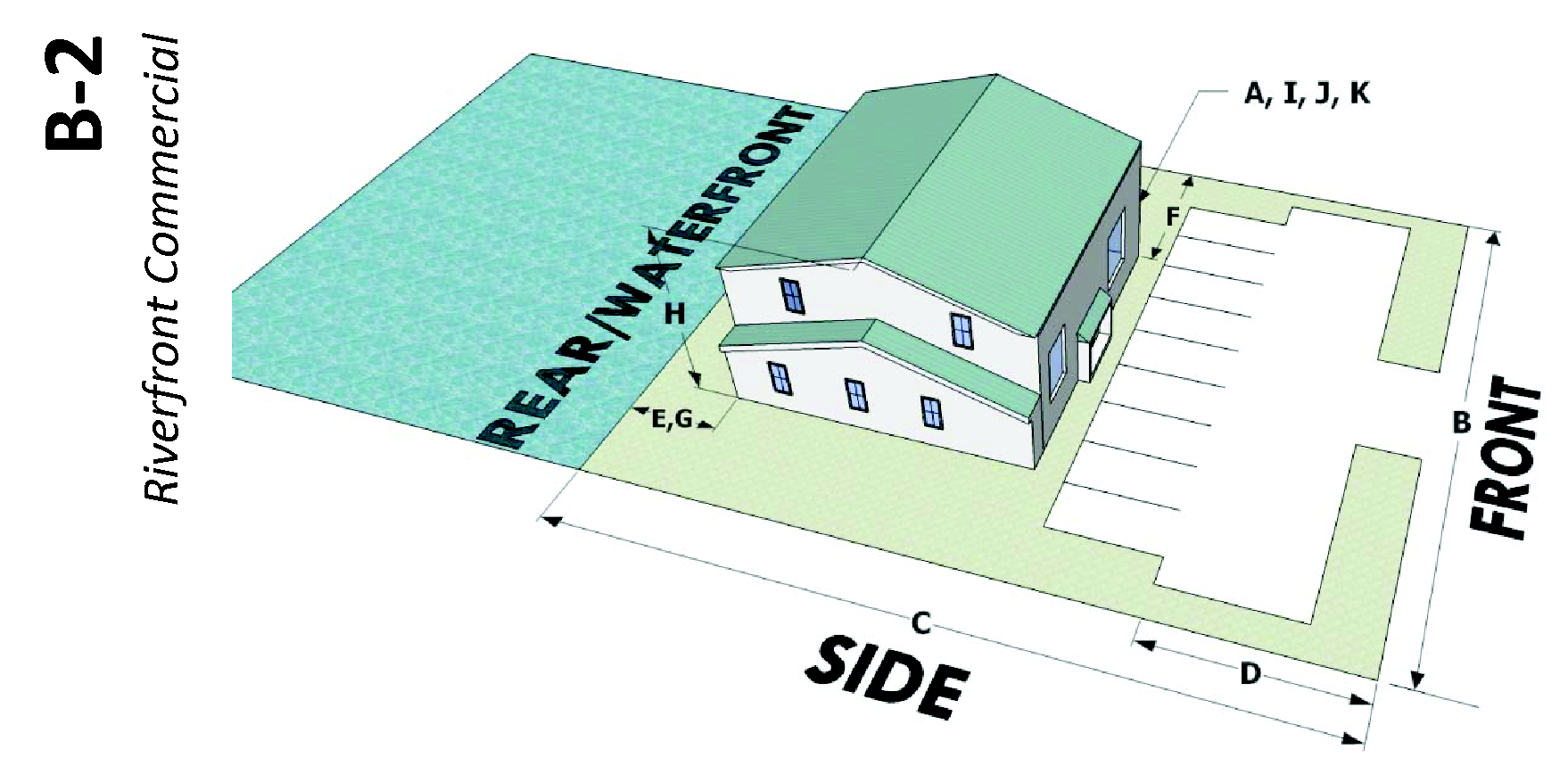 Uses that do not directly benefit from the waterfront, but that are permitted by this section, shall be located upland from the shoreline. Riverfront commercial projects that integrate a mix of permitted principal and accessory uses (such as garages in association with principal permitted uses only), boat slips, maintenance structures, etc., shall adhere to a common architectural theme.