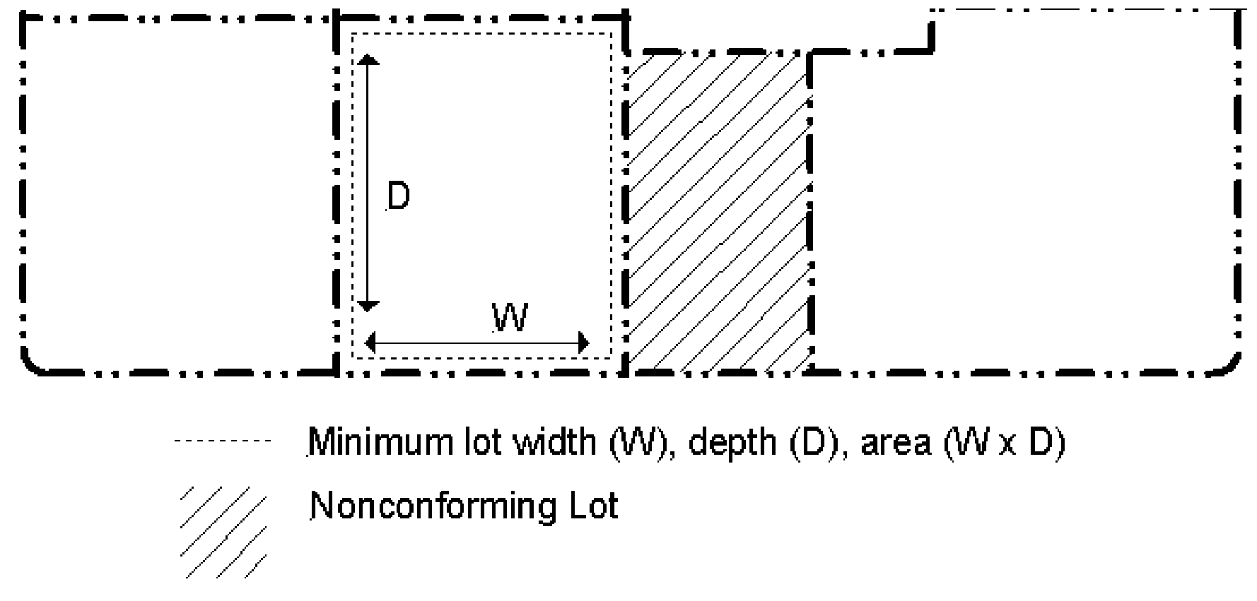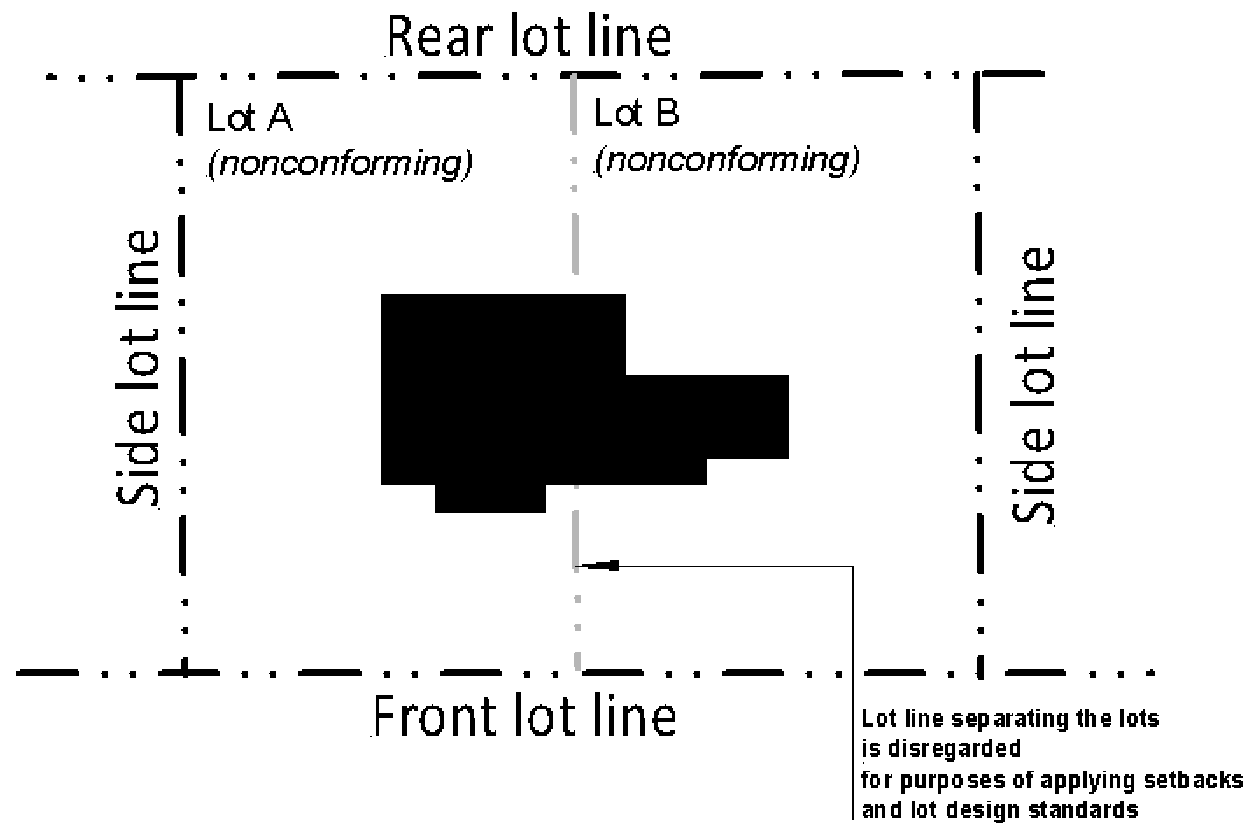 If more than one nonconforming lot with continuous frontage exists under single ownership, the lots will be treated as a single lot to meet all zoning district lot area requirements. A building or structure must comply with all lot design and development standards for the resulting "lot" (see section 4.6.3 and applicable zoning district regulations, article 2). For purposes of applying the setback standards, the front, side and lot lines are the combined front, side and rear lot lines of the combined "lot," and the lot line dividing the lots is disregarded.