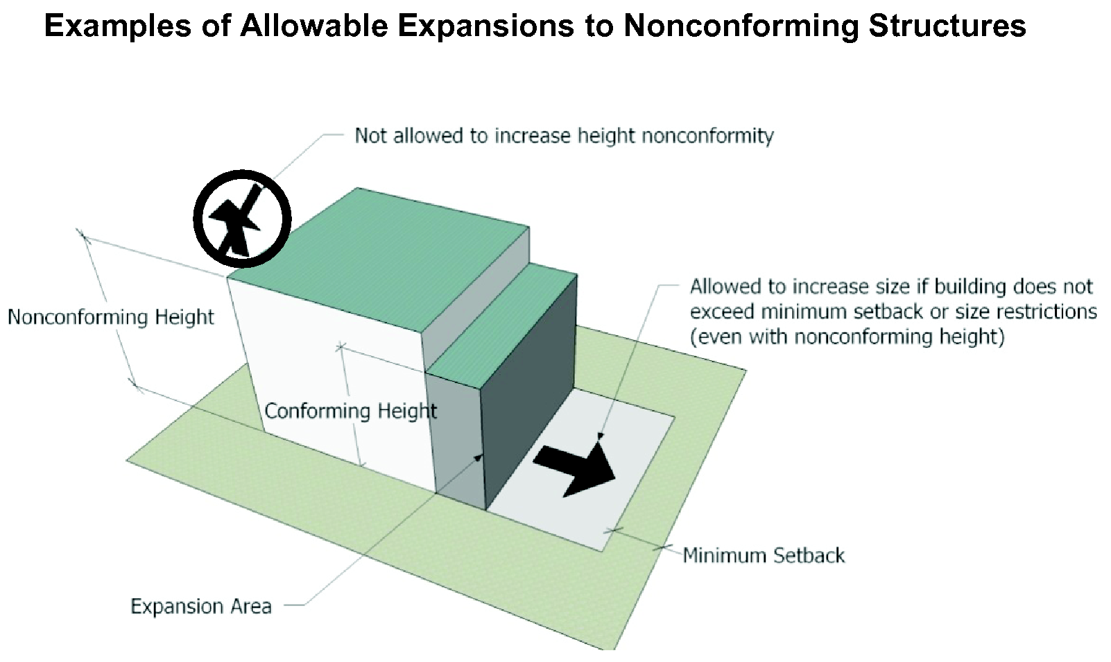 The following regulations apply to legal nonconforming structures. A "legal nonconforming structure" is a building or structure that complies with the zoning and land development regulations at the time of construction, but is no longer in compliance due to subsequent changes to the LUDC. A nonconforming structure includes but is not limited to any principal or accessory structure located within a required yard setback, or on a lot or parcel that does not meet the required lot coverage, height, density, floor area ratio (FAR), building envelope, or setbacks of its zoning district.