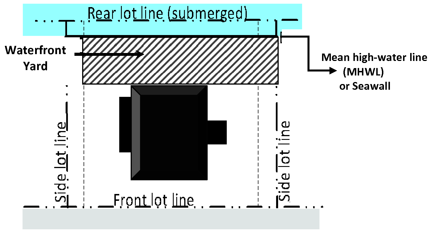 Yard, waterfront. A yard abutting a body of water. Except for residential properties with submerged TIIF-deeded lands, the waterfront yard is measured from the mean high-water line on tidal waters or the ordinary high-water mark on non-tidal waters whenever the mean high-water line or ordinary high-water mark falls within the lot lines. However, on lots with seawalls the yard shall be measured from the upland edge of the seawall.