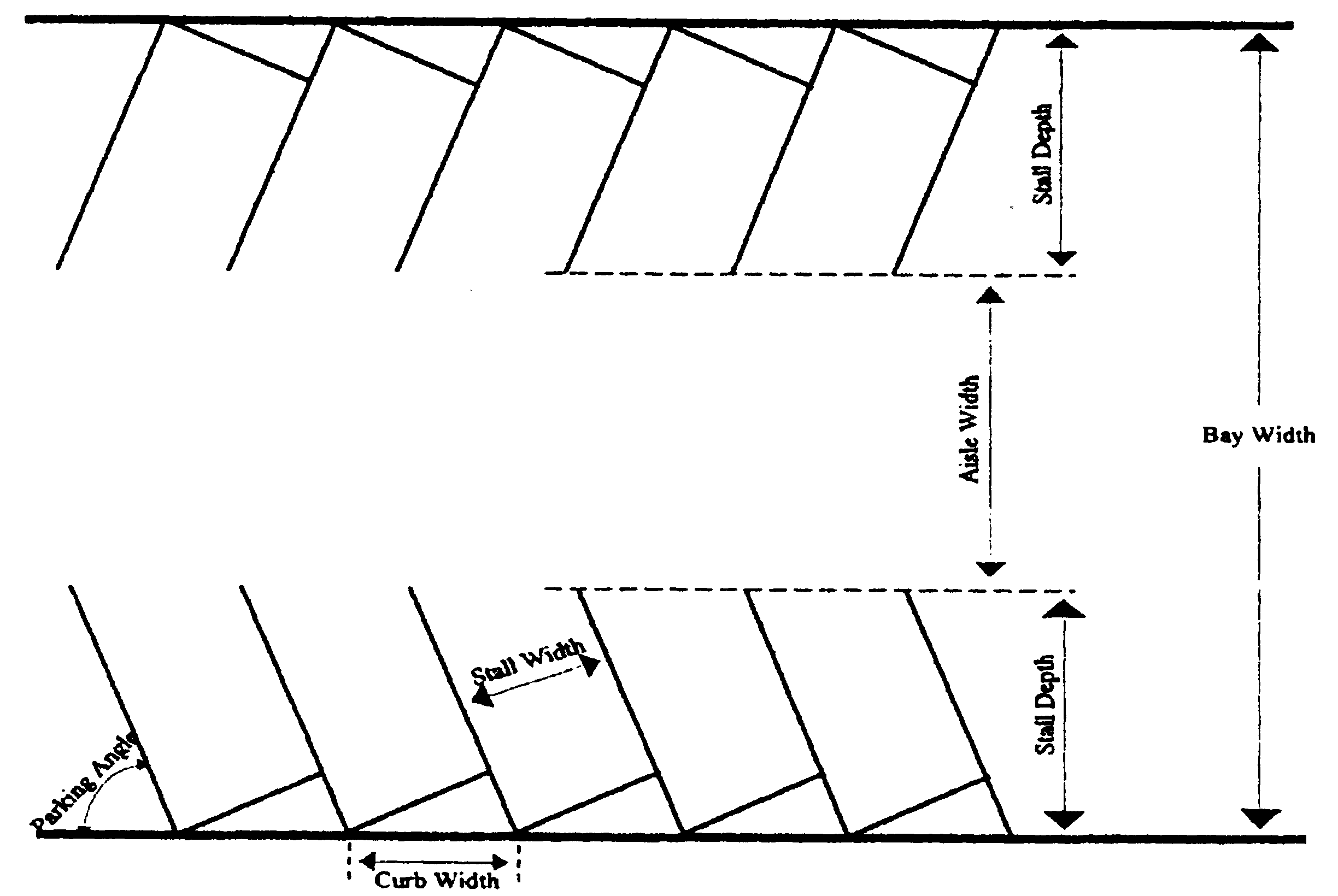 Angled parking. Aisle width and stall depth may vary based on parking angle. The following table provides the minimum standards: