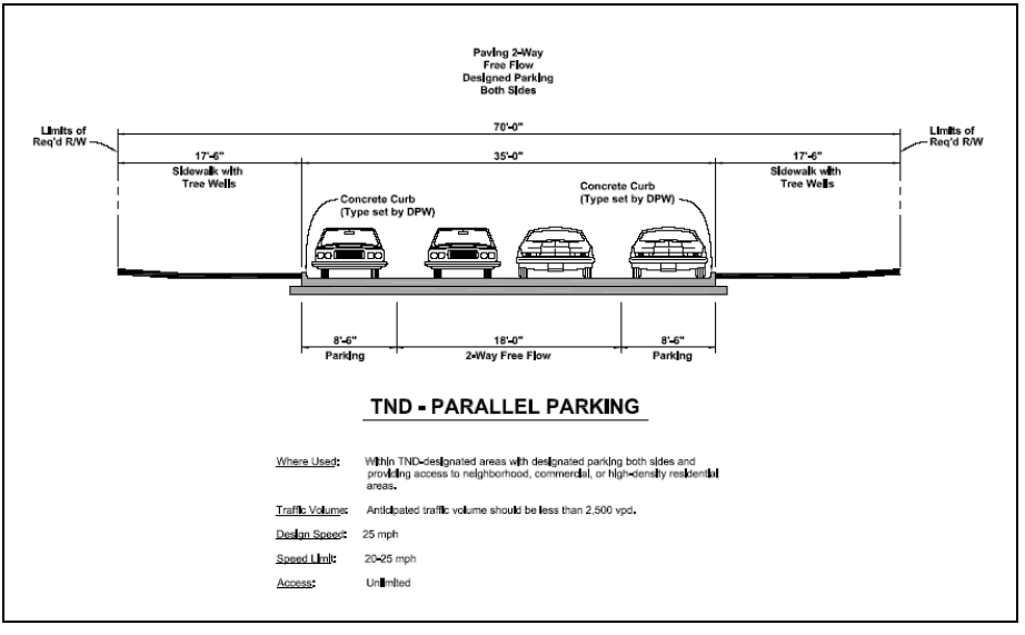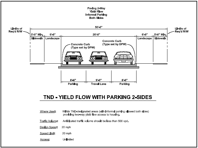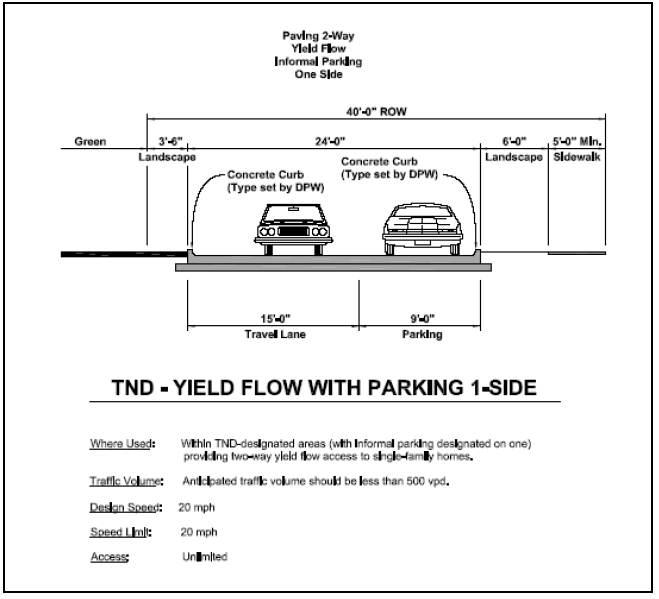 TND district street cross sections are featured below. The applicant may propose additional street cross sections specific to their development with their final development plan. Any proposed street cross sections differing from those contained below shall be required to be reviewed and approved by the mayor and the city council.