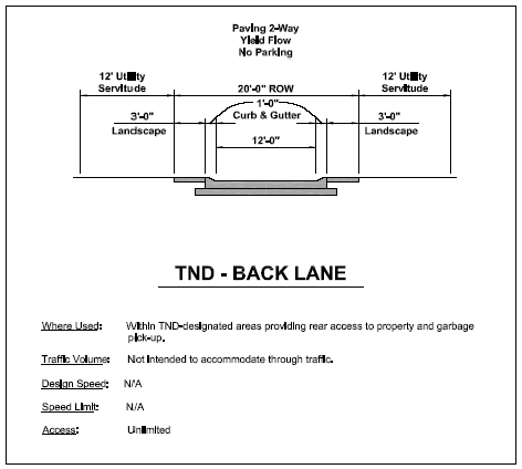 Notwithstanding the reference to a 12-foot utility servitude on the illustration above, the TND-back lane shall only be required to have a five-foot utility servitude on either side of the lane.