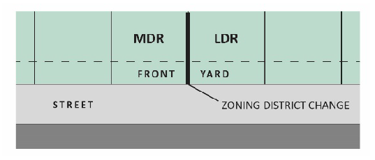 If one side of a block face is divided into two or more districts, all front yards shall comply with the requirement of the most restrictive district (see figure 2-12).
