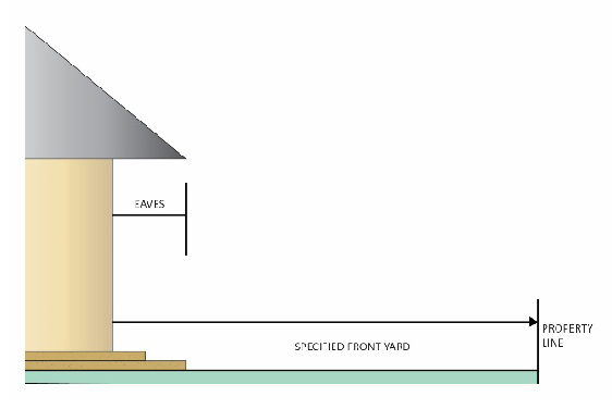 The front yard shall be measured from the property line to the front face of the building, covered porch, covered terrace or attached accessory building as shown in figure 2-13. Eaves and roof extensions or porches without posts or columns may project into the required front yard for a distance not to exceed four feet. Subsurface structures, platforms or slabs shall not project into the front yard to a height greater than 30 inches above the average grade of the yard.