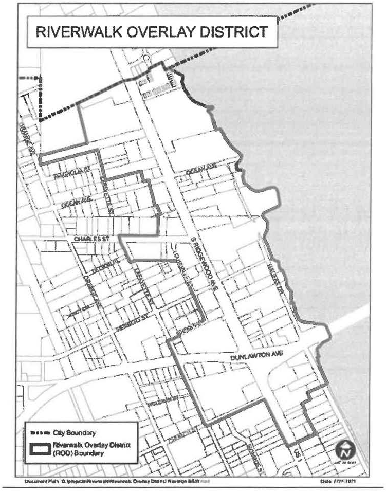 Halifax River, Rose Bay, and Strickland Bay: The area encompassed by the five-foot contour above mean sea level. This will include all of the islands in the Halifax River, except those lands currently zoned otherwise on the Port Orange Causeway. Areas behind existing seawalls at elevations less than five feet may be zoned in conformance with existing development.