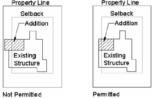 In cases where the primary building on a lot is nonconforming solely as a result of a setback encroachment, additions to the structure can be allowed, provided the new addition does not project into the setback. If a proposed addition would encroach into the same setback that already had been encroached upon, the addition can be allowed, provided that it projects no further into the setback than the existing structure, and in no way extends past the line of the existing structure. This section does not apply to a nonresidential use which adjoins a residential use on the side of the lot having the setback nonconformity (See Figure 6.2.50.A, Permitted Extensions for Nonconforming Buildings).