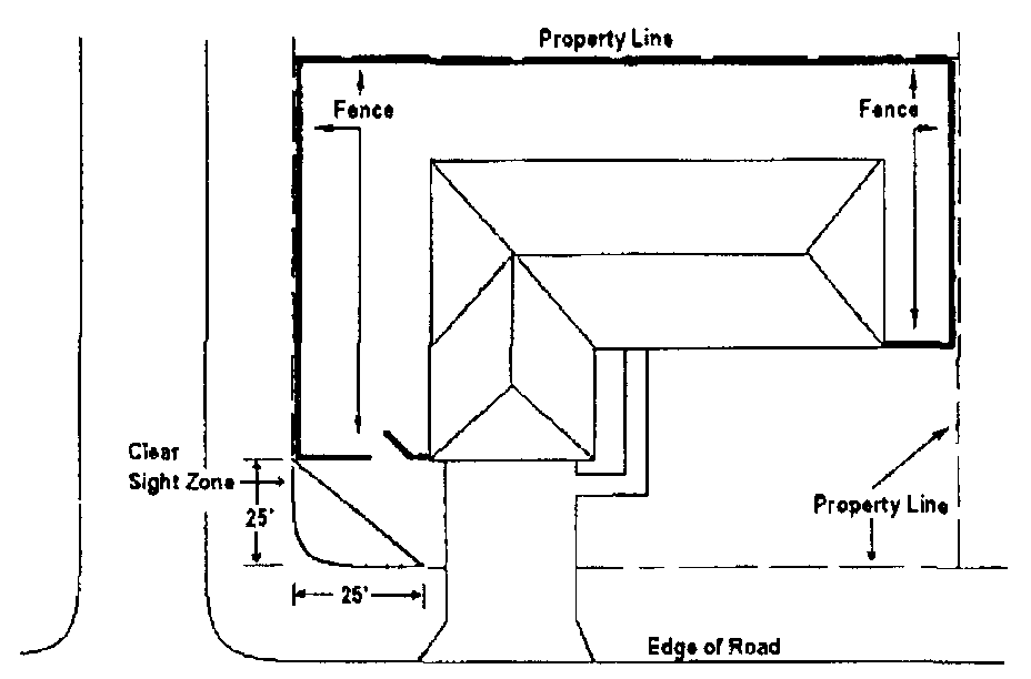 No fence, wall, hedge, or shrub planting which obstructs sight lines and elevations between two (2) and six (6) feet above the crown of the road shall be placed or permitted to remain on any corner lot in any zoning district within the triangular area formed by the street property lines and a line connecting them at points twenty-five (25) feet from the intersection of the street lines, or in the case of a rounded property corner from the intersection of the street property lines extended. The same sight line limitations shall apply on any lot within ten (10) feet from the edge of a driveway or alley. No tree shall be permitted to remain within the above described limits of intersections unless the foliage line is maintained at or above six (6) feet above the roadway intersection elevation to prevent obstruction of sight lines.