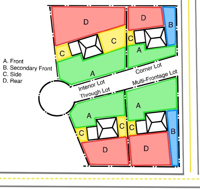 Lot Line, Front. In the case of an interior lot, the line separating the lot from the street right-of-way or road easement that is not classified as a secondary front lot line.