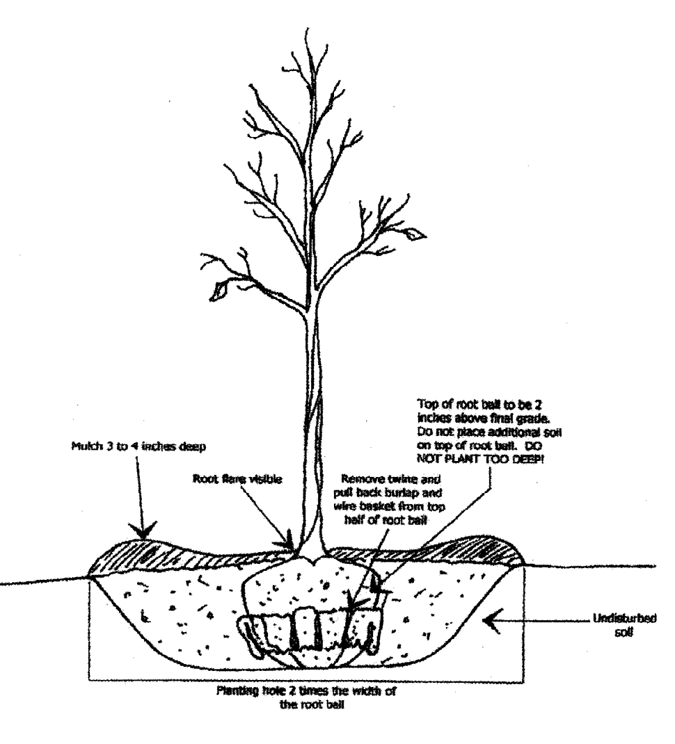 Water tree after planting. For mulch, use pine needles or seasoned mulch and use no more than three (3) to four (4) inches deep.