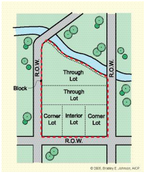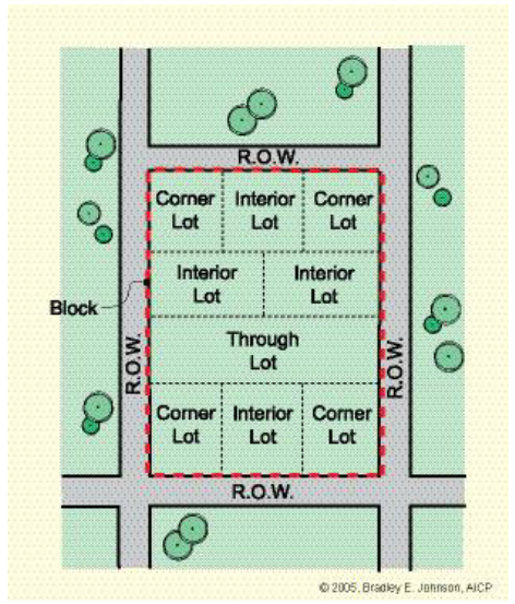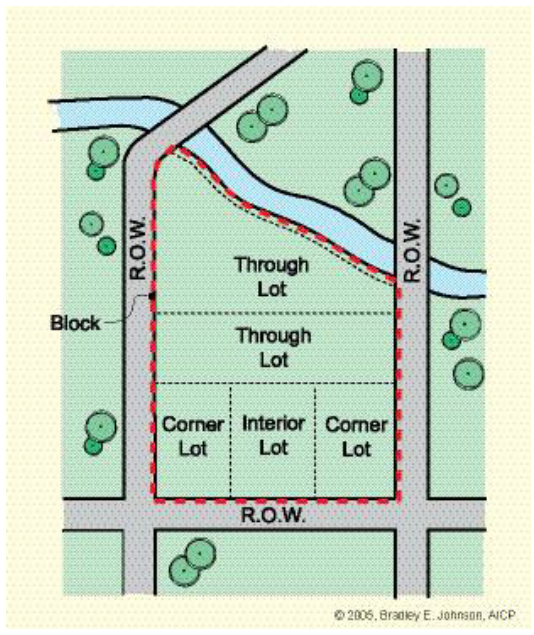 Block. Property abutting on one side of a street and lying between the two nearest intersecting streets (either crossing or terminating), railroad rights-of-way, lake, river, stream, or other physical boundary.