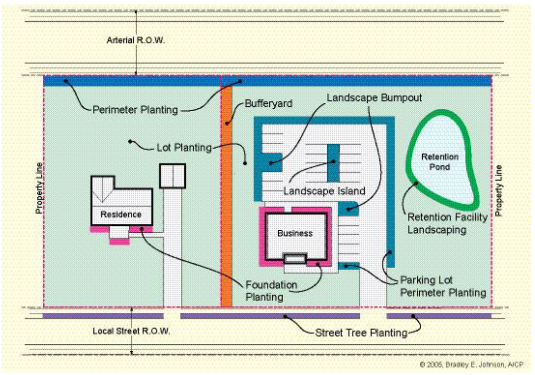 Streetscape. The overall character and appearance of a street formed by buildings an landscape features that frame the public street, including but not limited to facades of buildings, street trees and plants, lighting, street furniture, and paving.