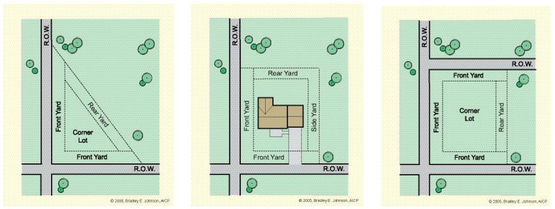 Yard. Open and unobstructed space on the same property as a primary structure except as otherwise authorized by the zoning ordinance. Yard types follow with diagrams: