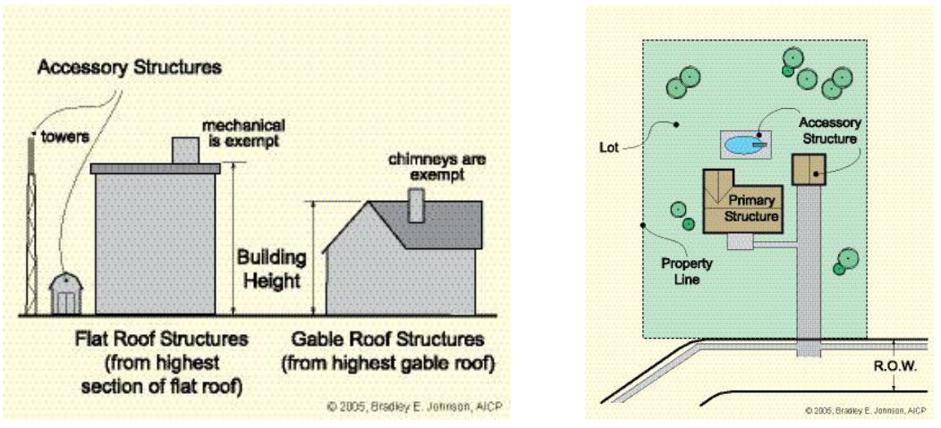 Structure height. The vertical distance measured from ground level to the highest point of the roof. See diagram below.