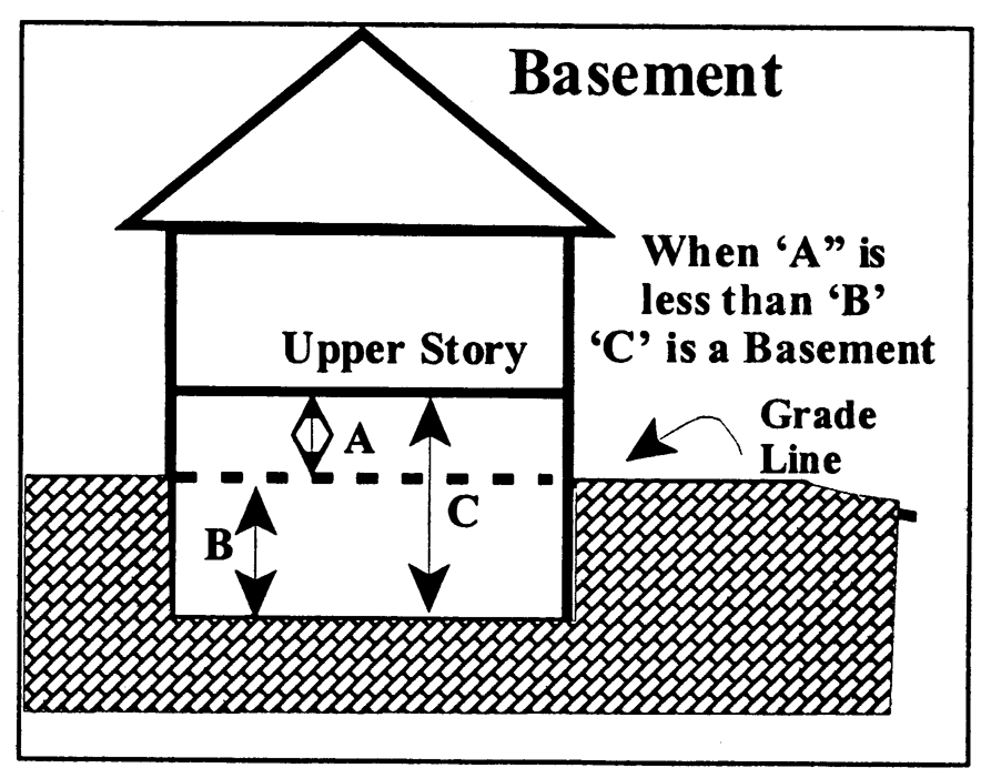 Basement: That portion of a building between floor and ceiling which is partly below and partly above ground level but so located that the vertical distance from grade to the floor below is greater than the vertical distance from grade to the ceiling above. A basement shall not be counted as a story.