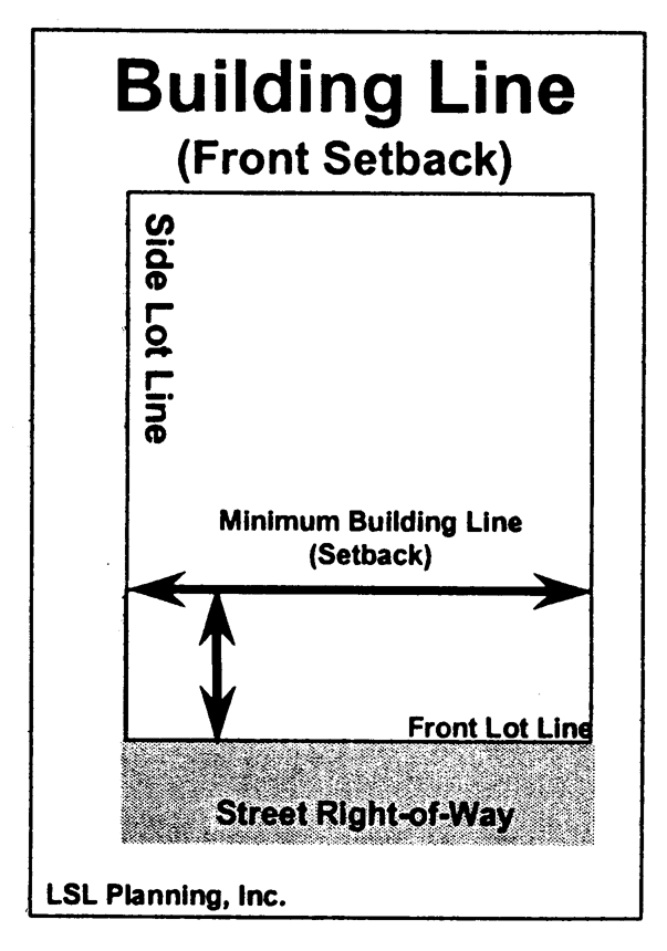 Building line: An imaginary line measured between the side lot lines at a distance from the front lot line as required by the district in which the lot is located. For the purposes of this chapter, a building line is the same as a front setback line.