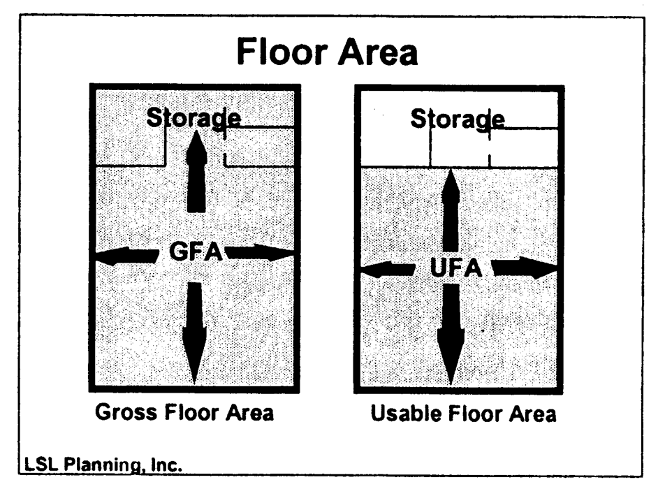 Floor area, usable (UFA): For the purpose of computing parking, that area used for or intended to be used for the sale of merchandise or services, or for use to serve patrons, clients or customers. Floor area used or intended to be used principally for the storage or processing of merchandise, for hallways, or for utilities or sanitary facilities shall be excluded from the computation of usable floor area. Measurement of usable floor area shall be the sum of the horizontal areas of the several floors of the building, measured from the interior faces of the exterior walls.