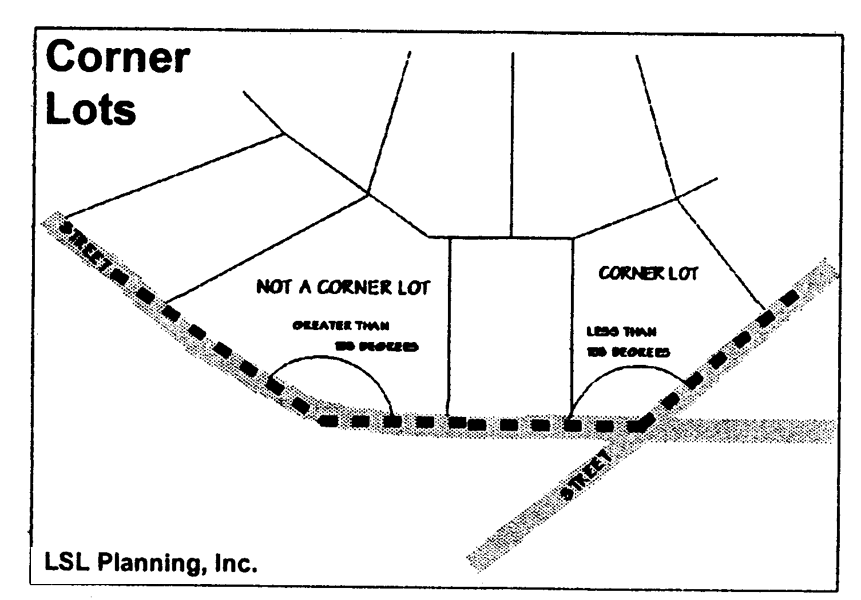 Lot, corner: A lot where the interior angle of two adjacent sides at the intersection of two streets is less than 135 degrees. A lot abutting on a curved street shall be considered a corner lot for the purposes of this chapter if the arc is of less radius than 150 feet and the tangents to the curve, at the two points where the lot lines meet the curve or the straight street line extended, form an interior angle of less than 135 degrees.