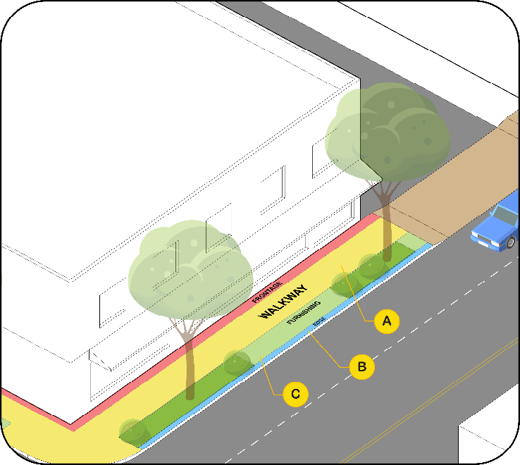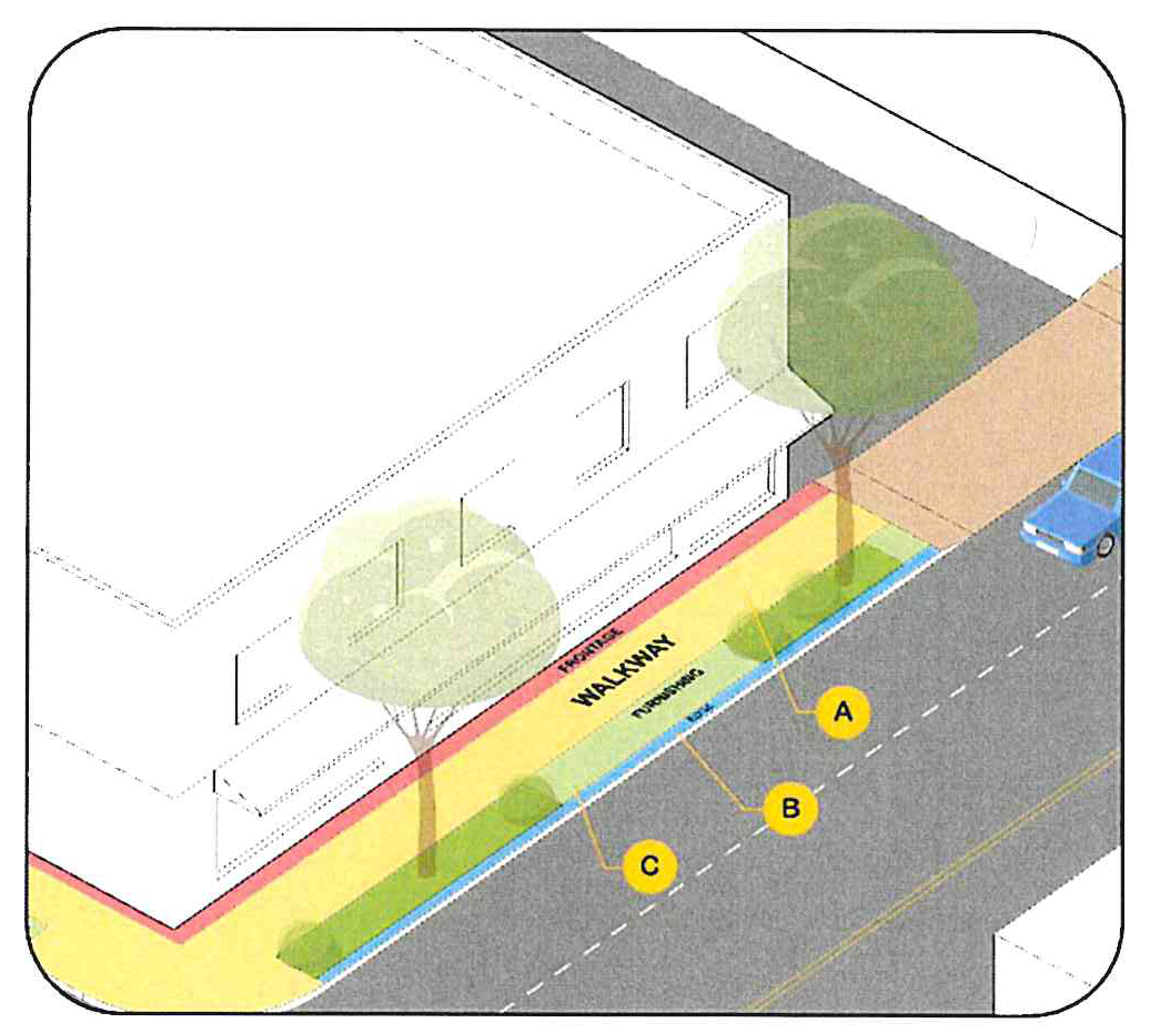 As shown in figure 3 below, the pedestrian zone in the LC district should contain four distinct areas: