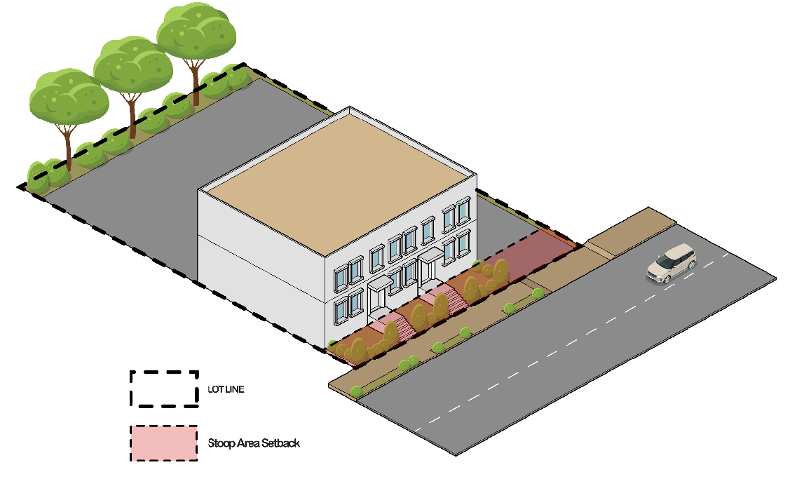 Residential ground-floor uses. First-floor of building (including principal entrance) in the edge and business areas may be raised up to three feet above the grade of the adjacent sidewalk. This is intended to create greater privacy for first floor residential uses by elevating windows above the view of passing pedestrians.