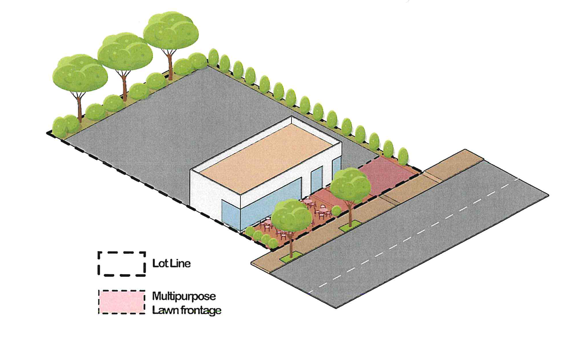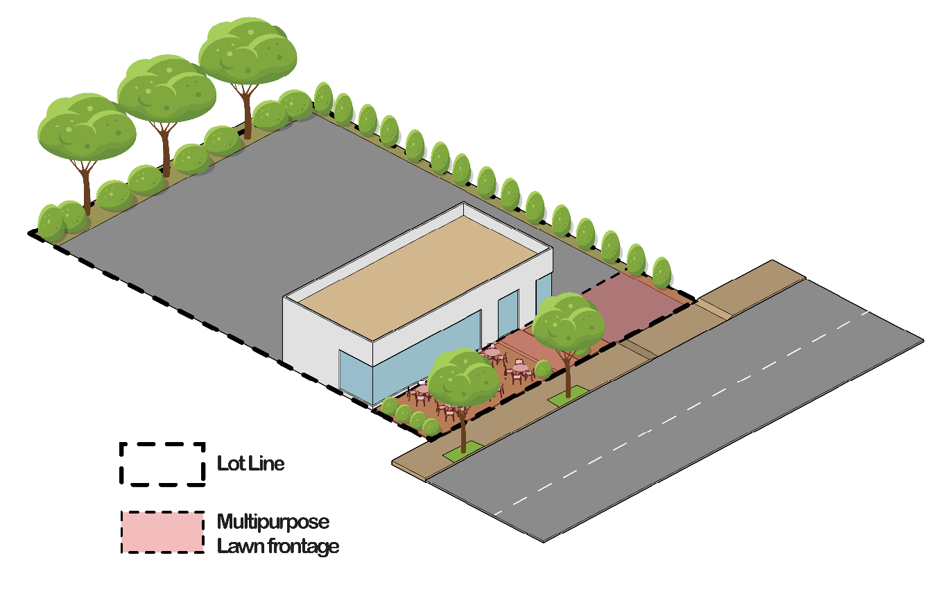 Frontage area. The frontage area is the portion of the pedestrian zone adjacent to the edge of the right-of-way. The frontage area is an optional area and may be used for street furniture or other uses accessory to the use in the adjacent building. When a building is constructed at the lot line, the frontage area should have a minimum width of two feet to accommodate opening doors and window shopping; in the LC-Edge and LC- Business area, the frontage area can be in the required setback.