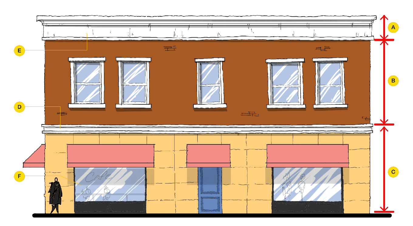 Figure 1: A regular 2 story building with a base, middle and a cap. The horizontal molding or reveal (A) can be considered as base with entrances located in between and the windows of the first floor sitting between the horizontal band and the "middle (B)" which visually separates the first floor and the second floor. The Cap (C) is the thick molding on the roof running along the perimeter of the building.