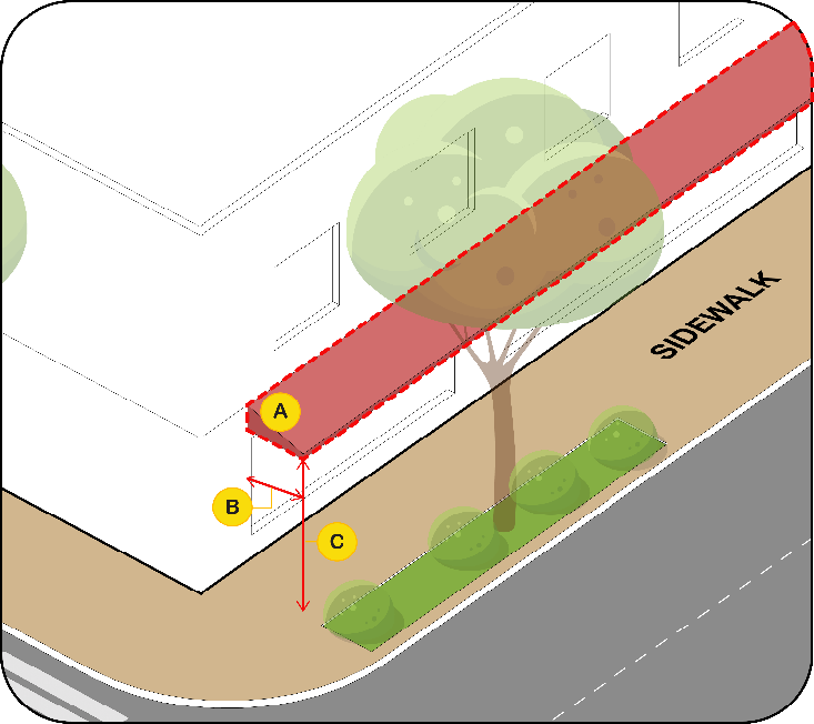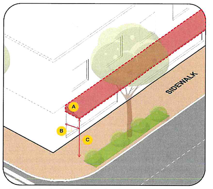 Ground-story awnings may encroach up to six feet (Figure 2.B, below) from the face of the building into the setback or right-of-way area, but may not interfere with street lighting or trees.