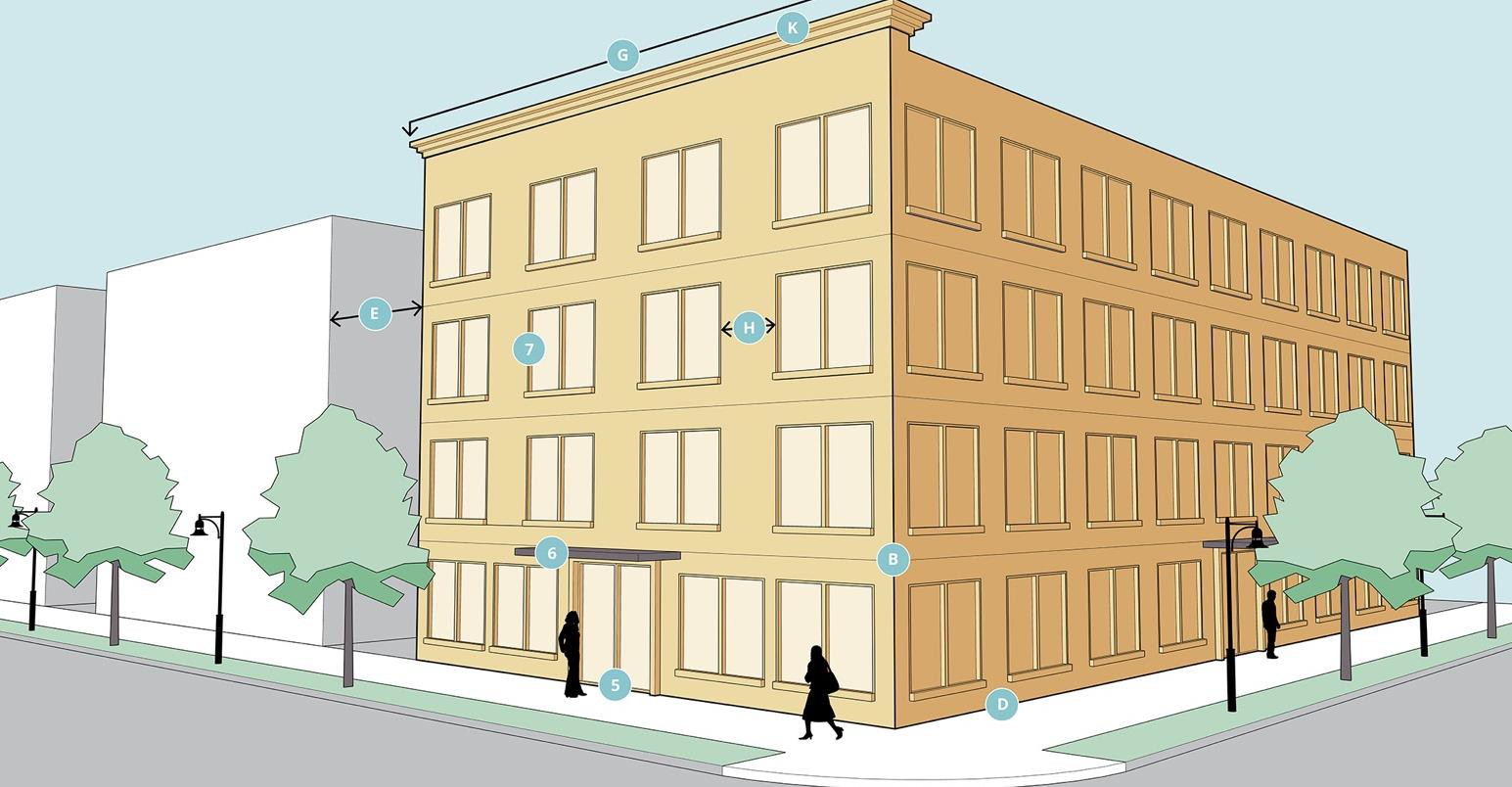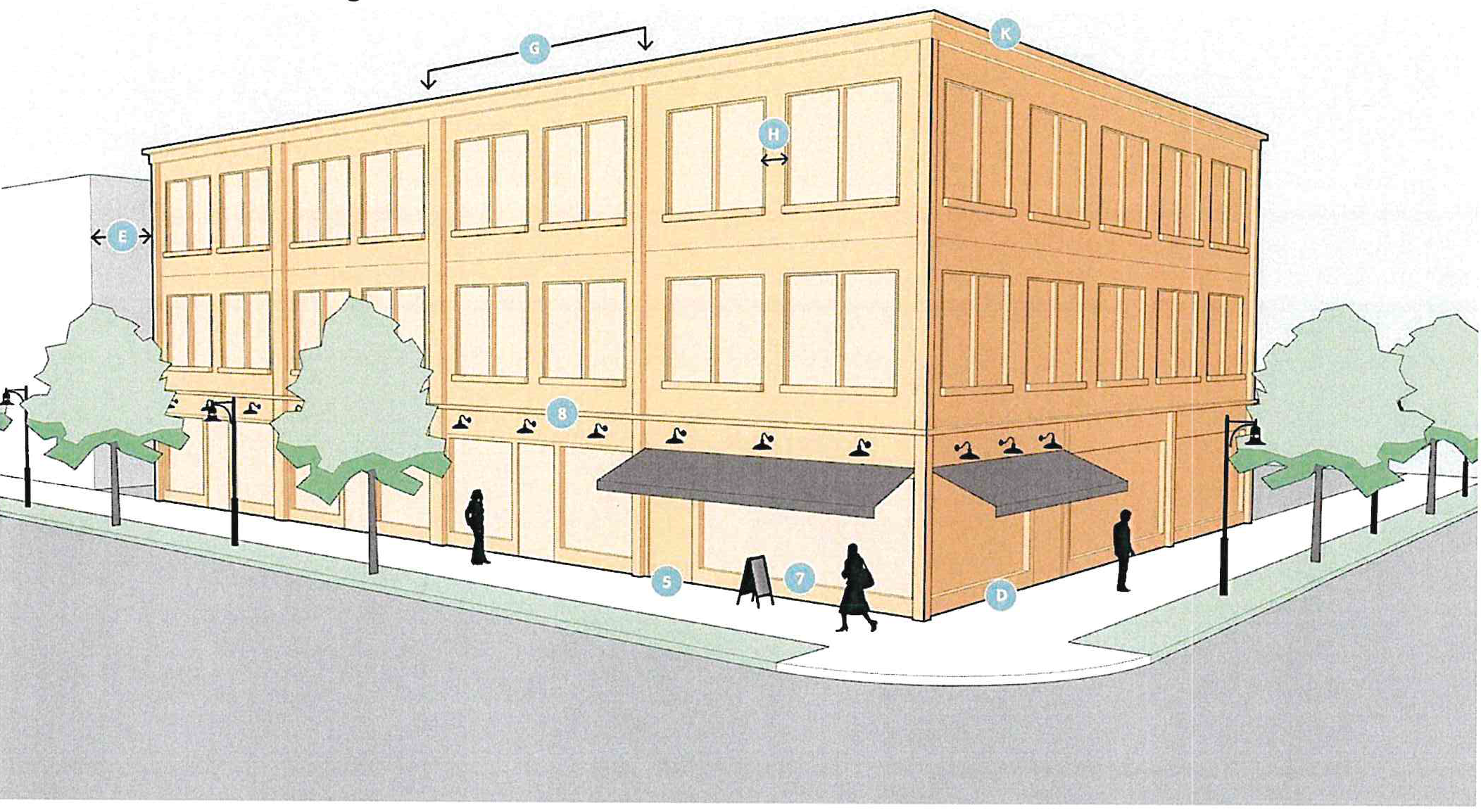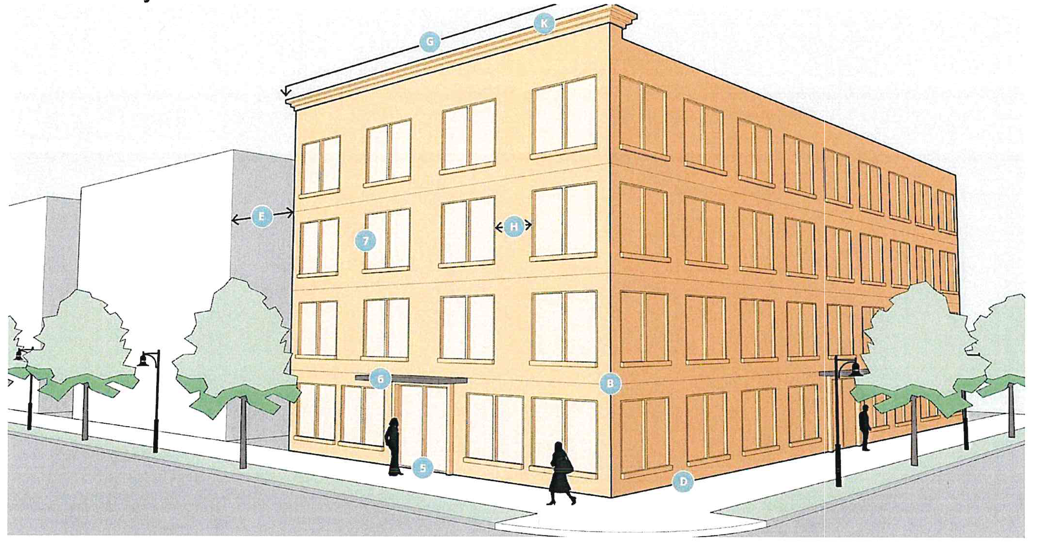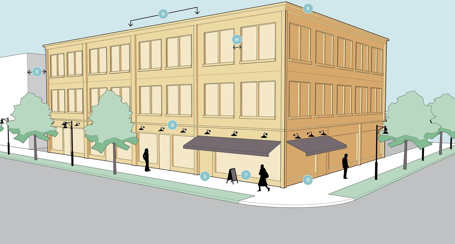 The following building design standards are applicable to all buildings. Refer also to section 42-455.B and section 42-455.C. for design standards applicable to mixed use and single story retail buildings: