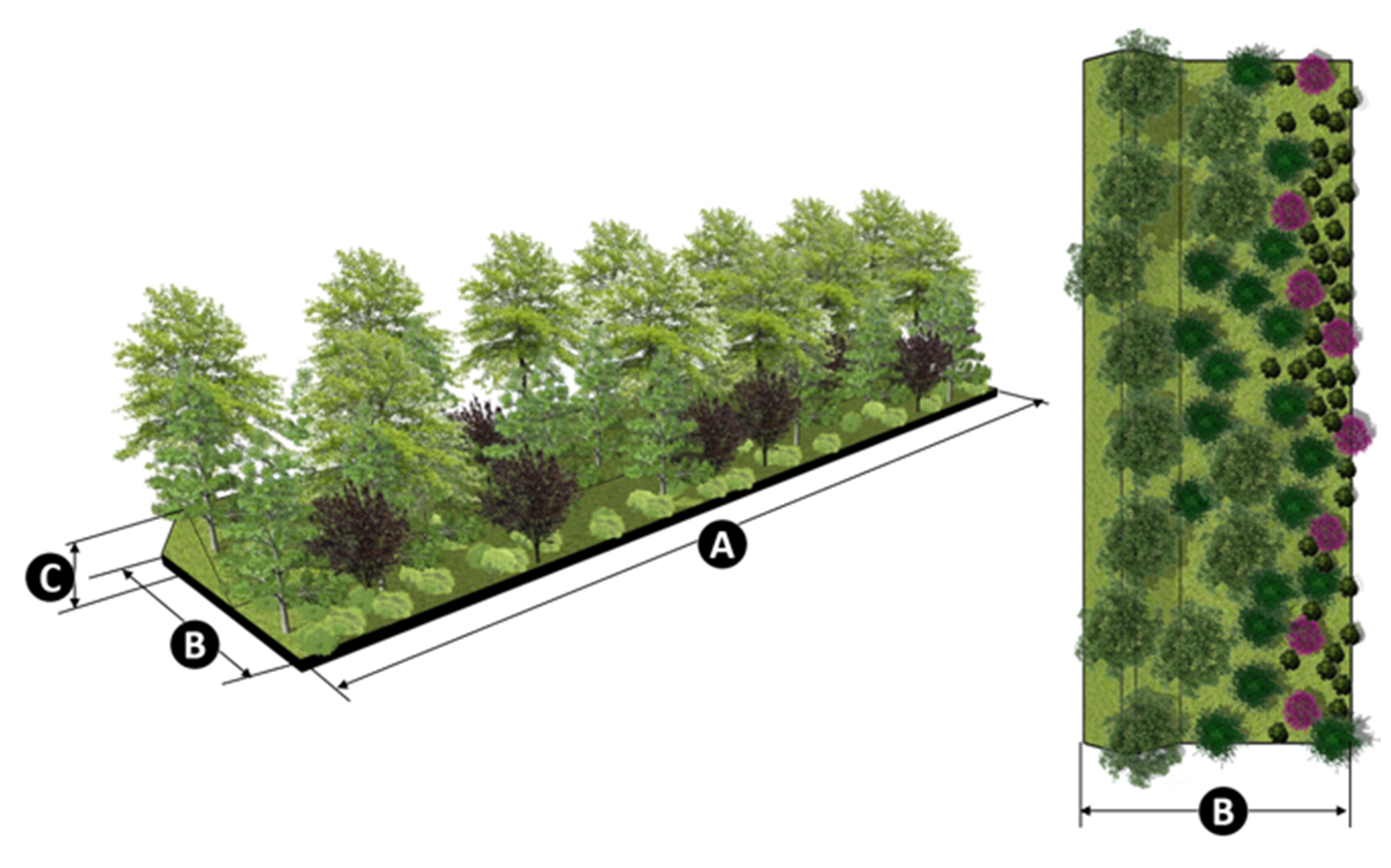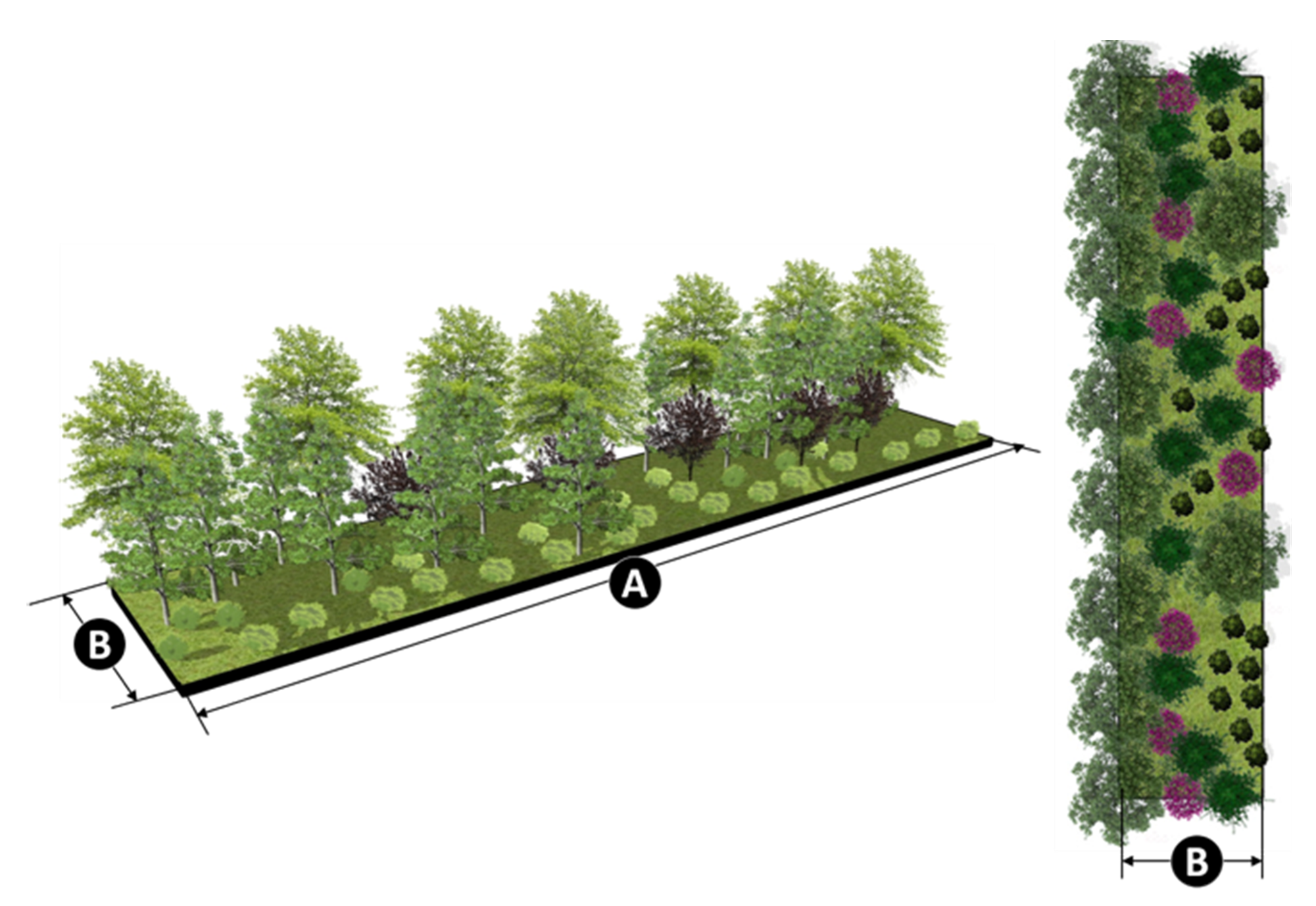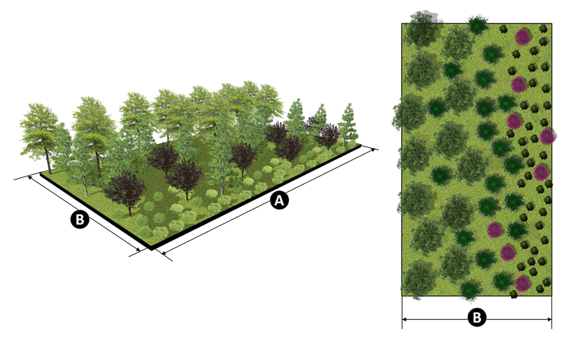 Landscape materials can be combined to include a dense mix of trees and massed low to medium-height shrubbery.