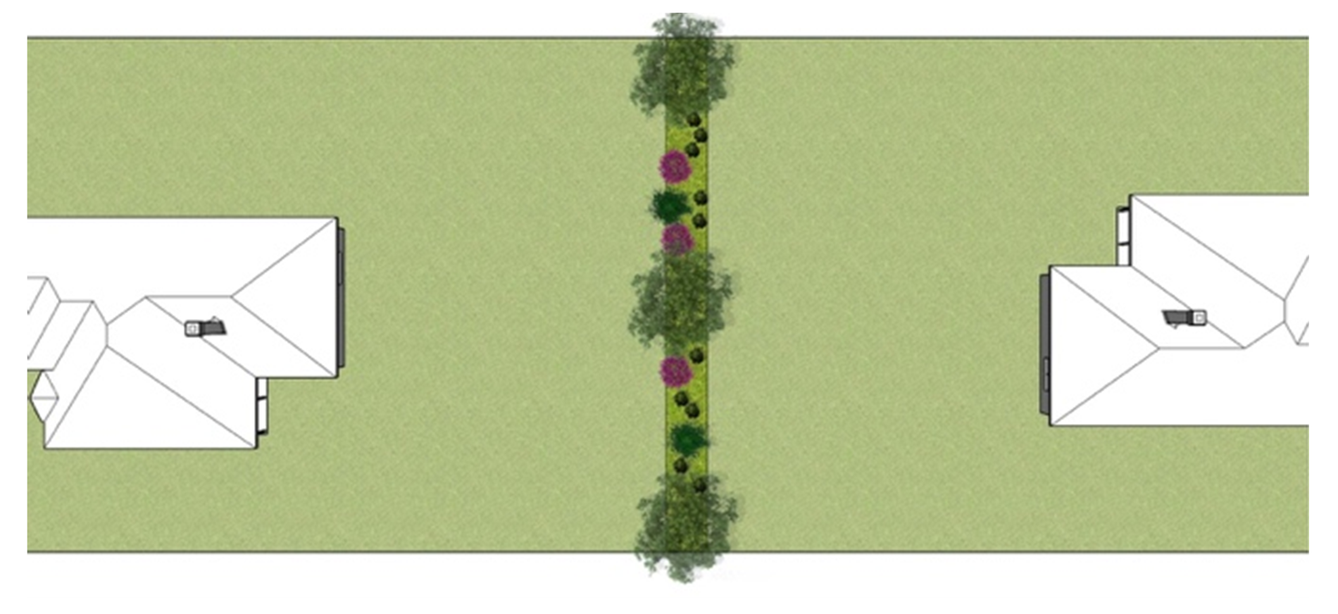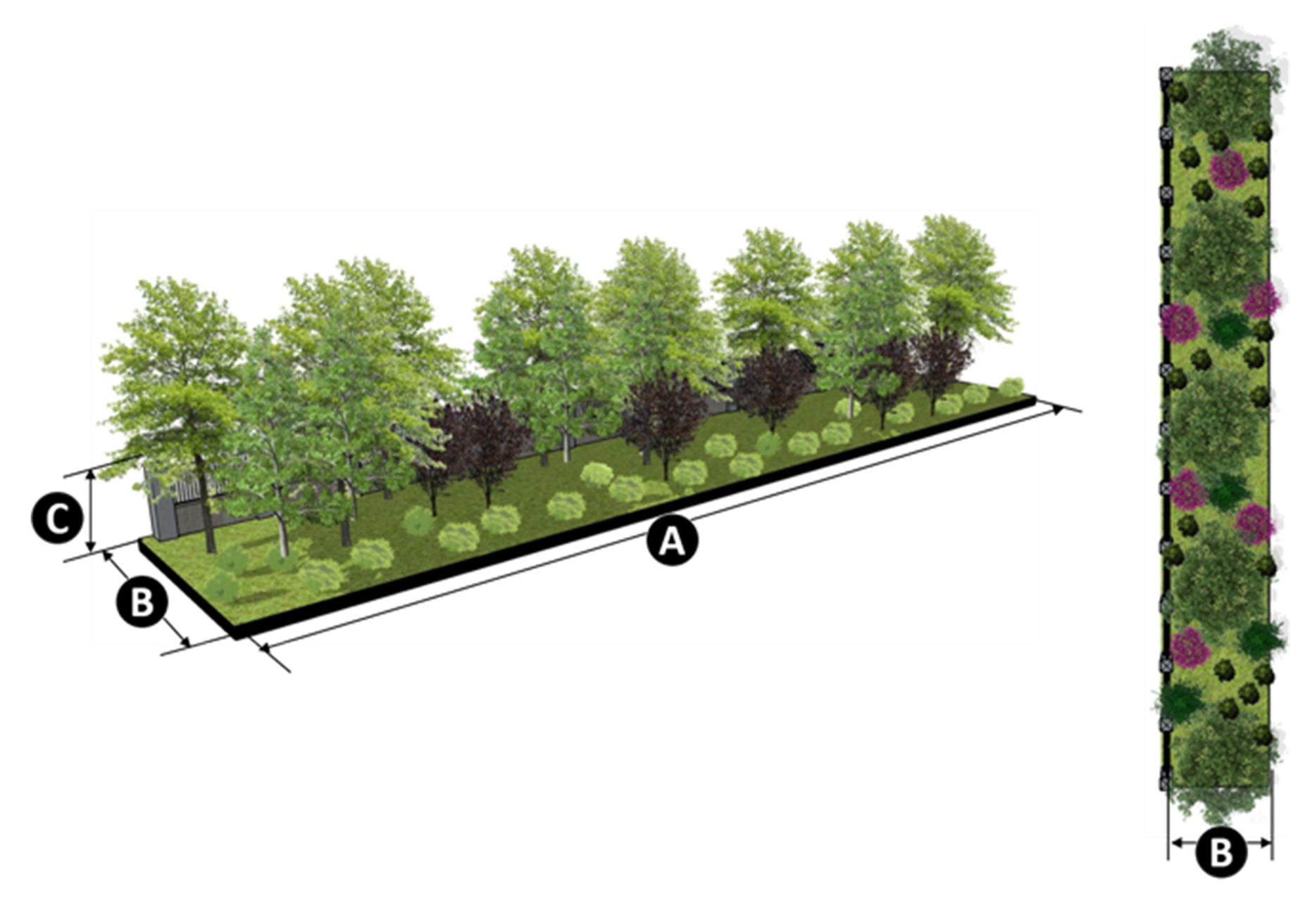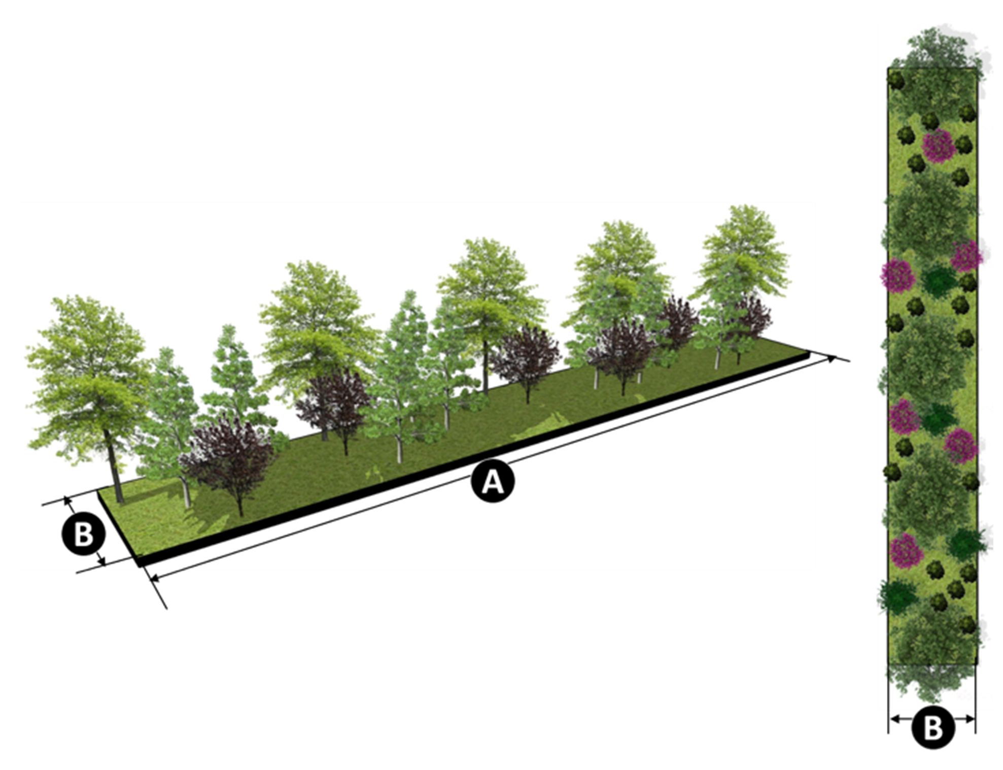 Landscape materials can be combined to include a dense mix of trees and massed low to medium-height shrubbery.