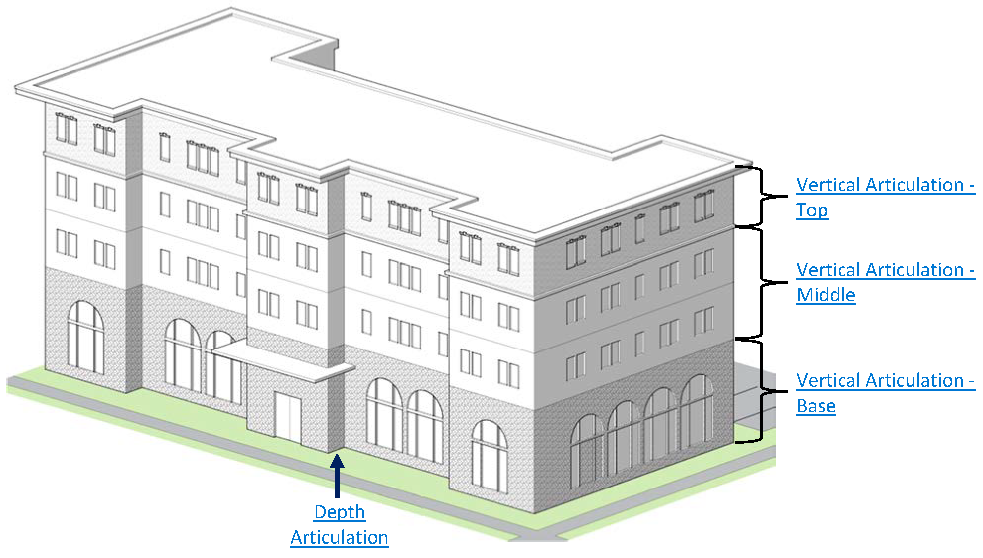 Façade depth and height articulation shall be required on all exterior façades of a building: