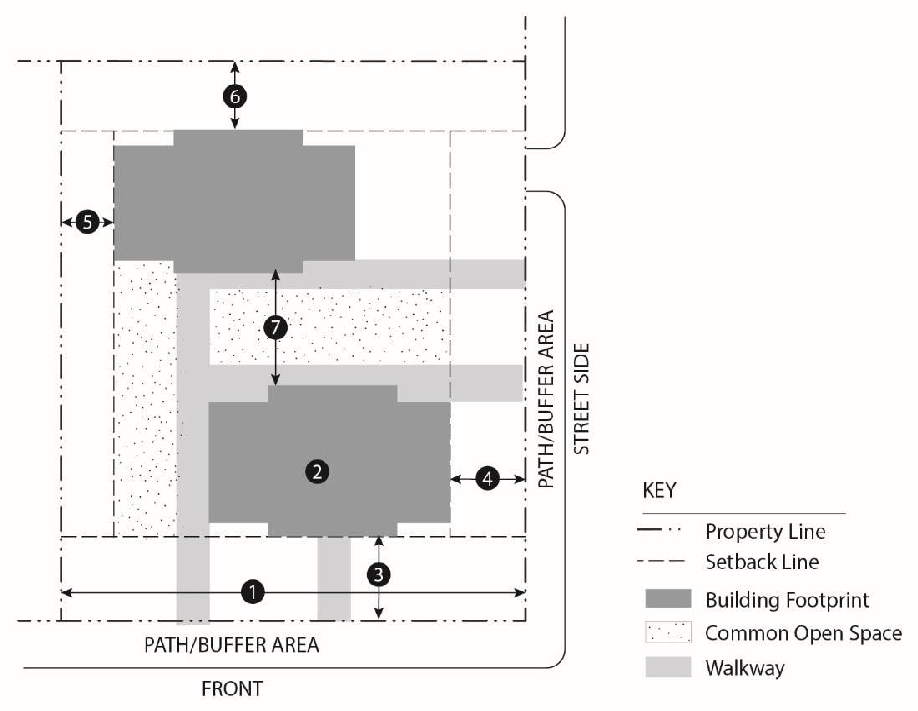 Table 18.23.050, Development standards—Mixed-use zoning district, establishes the development standards for the mixed-use zoning districts. The numbers in each illustration refer to corresponding regulations in the table that follows.