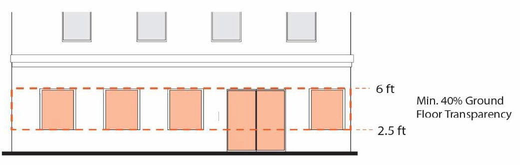 Non-Residential Ground Floor Transparency. A minimum forty percent of ground floor street-facing non-residential facades between two-point-five and six feet in height shall be transparent window surfaces with no more than a five percent tint. Mirrored windows are not allowed.