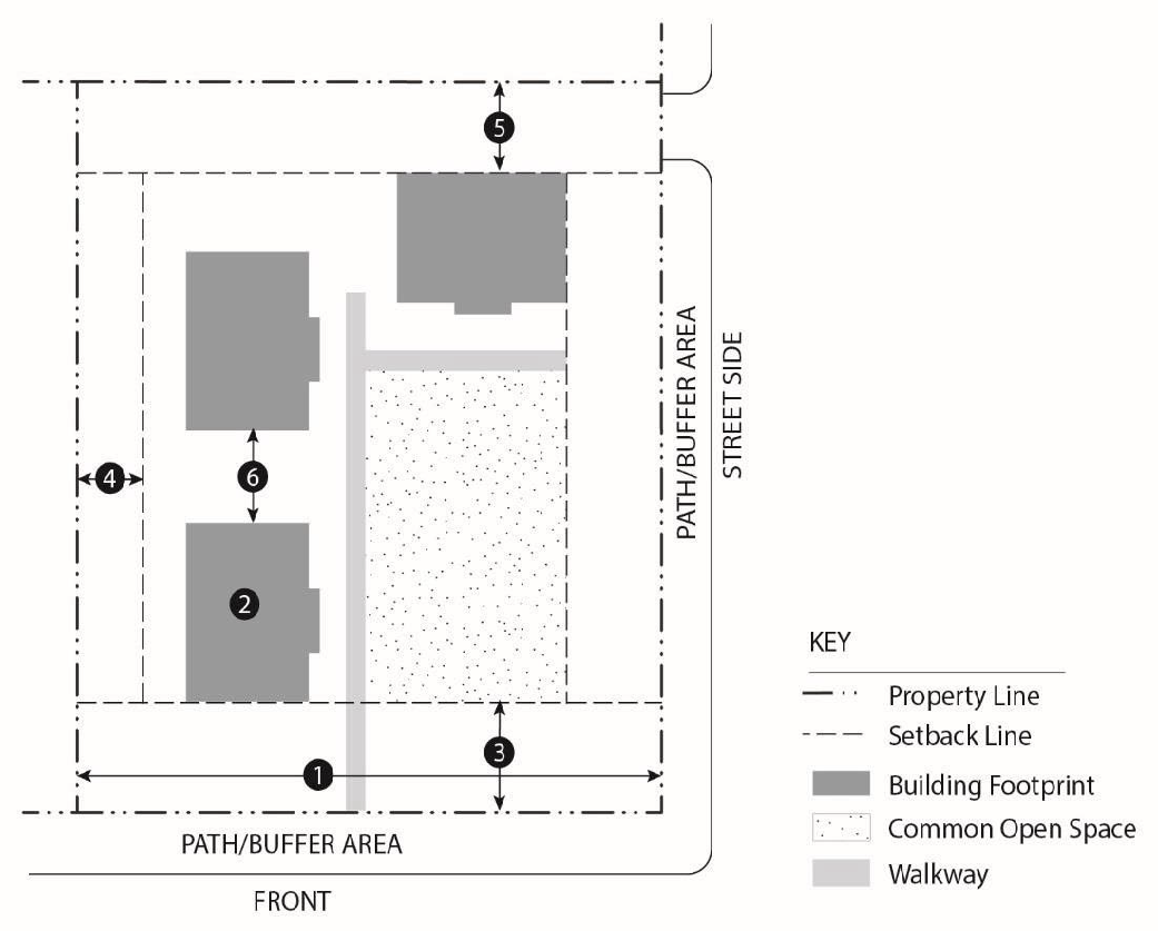 Table 18.15.050, Development standards—Multi-family residential zoning districts establishes the development standards for the R-MF zoning districts. The numbers in the figure below correspond with the regulations in the table that follows.