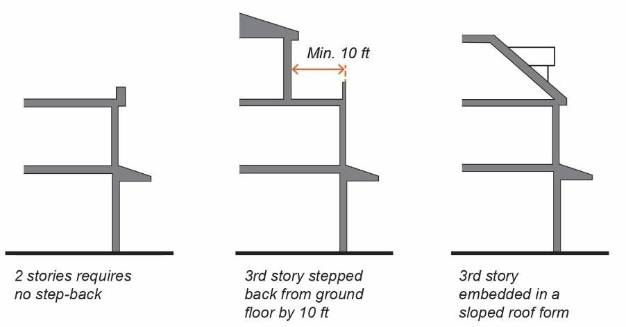 Street-Facing Upper-Story Step-Backs. Along the front and street side façade, the third story must be stepped back a minimum of ten feet from the ground floor façade or be embedded in a sloped roof form.