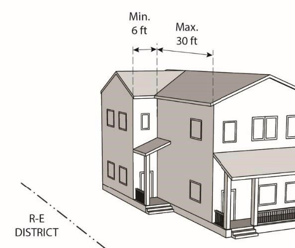 Building Massing Abutting the R-E Zone. Building façades abutting and facing the R-E zone may not exceed thirty feet in width without a break of minimum six feet in depth.
