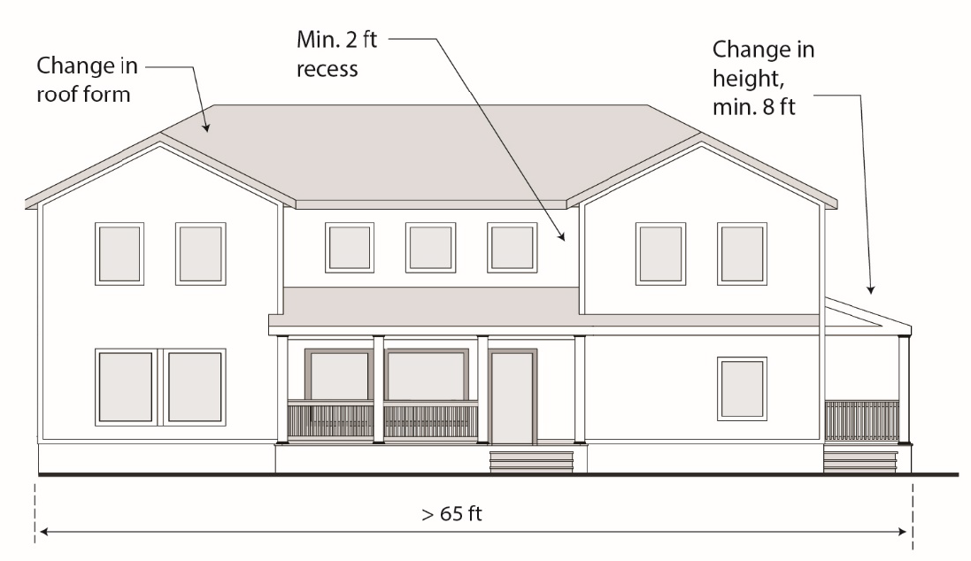 When a building façade exceeds sixty-five feet in length along a right-of-way, it must be separated into façade bays no greater than fifty feet in width defined by a recess or offset a minimum of two feet in depth and at least one of the following strategies: