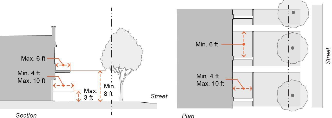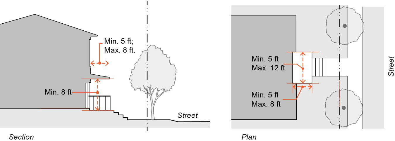 Depth of stoop: Minimum five feet, maximum eight feet.