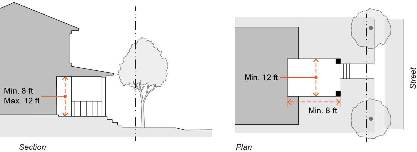 Clear height, if porch is covered: Minimum eight feet, maximum twelve feet.