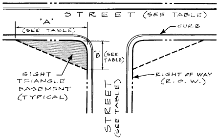 At public street intersections, the 2 intersecting street right-of-way lines and a line connecting the right-of-way lines at the points indicated in the Table 8-3 delineates the sight visibility triangle. The connecting points shall be measured from the right-of-way lines extended to their point of intersection.