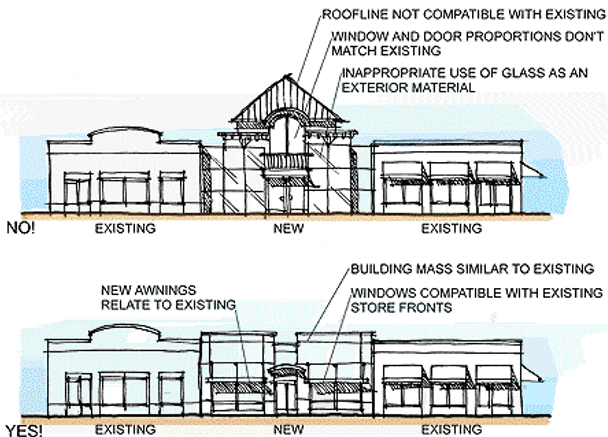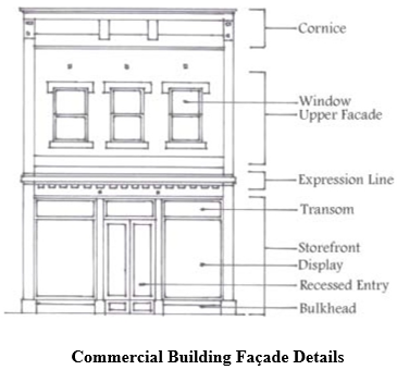Materials on the facade to be avoided include metal or aluminum siding, reflective materials and finishes, and unfinished concrete block.