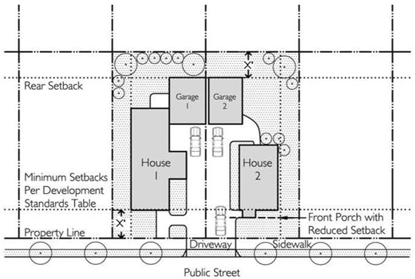 The use of a covered porch, stoop, and/or other entryway feature is encouraged for the dwelling's primary entrance. A minimum front porch depth of 6' and a minimum area of 40 square feet is encouraged.