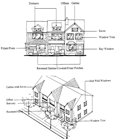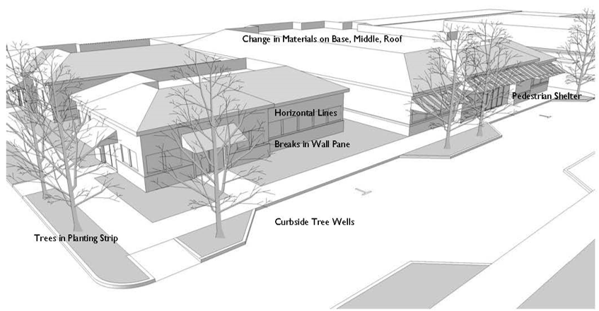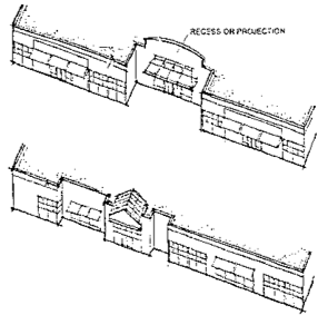 Projections and recesses should be used to provide shadow and depth. Therefore, long, unbroken volumes and large, unarticulated wall and roof planes should be avoided. In addition, building forms should be articulated by varying roof heights and wall planes.