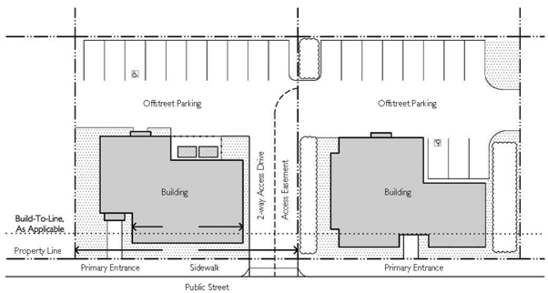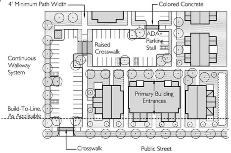 Pedestrian-scale development: Development designed with an emphasis primarily on the street sidewalk and on pedestrian access to the site and building, rather than auto access and parking areas. The building is generally placed close to the street and the main entrance is oriented to the street sidewalk. There are generally windows or display cases along building facades which face the street.