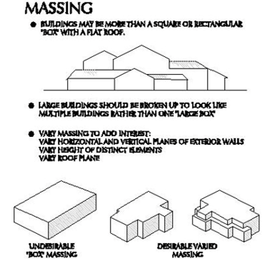 Massing: The overall visual impact of a structure's volume; a combination of height and width and the relationship of the heights and widths of the building's components.