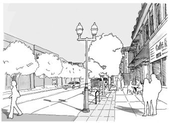 Streetscape: The appearance and organization along a street of buildings, paving, plantings, street hardware, street furniture, and miscellaneous structures.